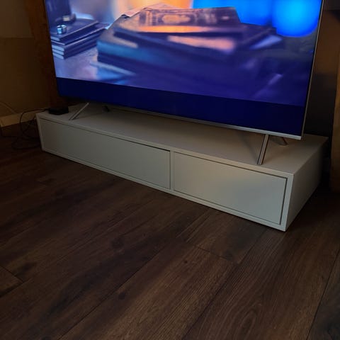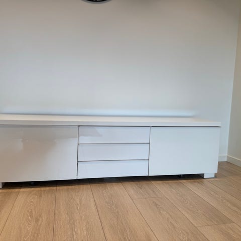 Bohus TV-benk i hvit utførelse. Møbelet har to skapdører og åpne hyller i midten som gir plass til TV-utstyr, spillkonsoller eller annet elektronisk utstyr. Egnet som TV-møbel eller mediebenk i stue eller oppholdsrom.