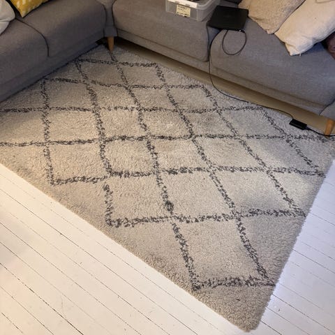 teppe i rektangulær form. Teppe i beige fargetone med lysere, langsgående stripemønster. Passer for eksempel i gang, stue eller soverom. Materiale og nøyaktige mål er ikke oppgitt av selger.