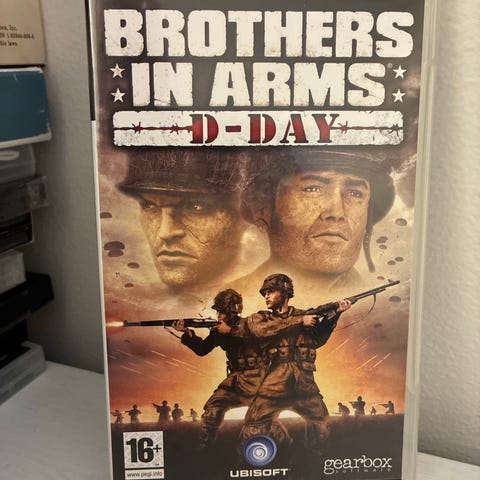 Brothers in Arms D-Day PSP spill. Action- og krigsspill satt til andre verdenskrig, utviklet for PlayStation Portable (PSP). Spillet leveres på UMD-disk i original eske med omslag og manual, og er merket med aldersgrense 16 år.