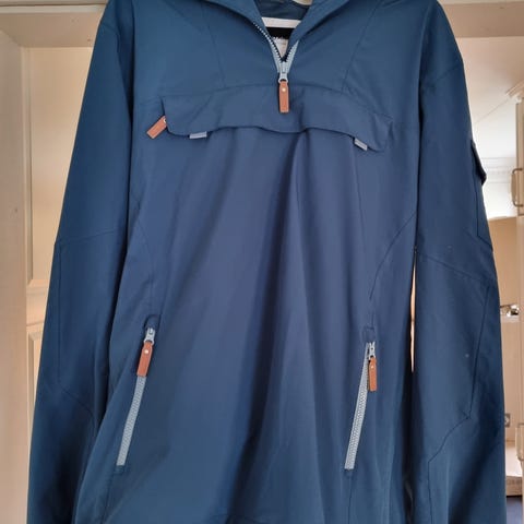 Flotte detaljer med cord i halsen, splitter i siden, emblem på arm.