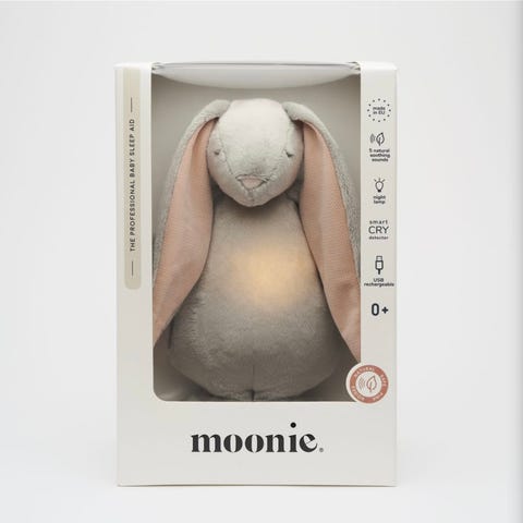 Denne søte kosebamsen er ikke som alle andre bamser – Den har nemlig lys og lyd! Moonie 2.0 er en søt kaninbamse med innebygd nattlampe og beroligende lyder, designet for å hjelpe babyer og små barn med å sovne raskere og sove bedre. Denne myke og koselige bamsen kombinerer naturlige lyder og beroligende lys for å skape en trygg og avslappende atmosfære for babyen
