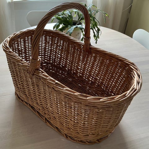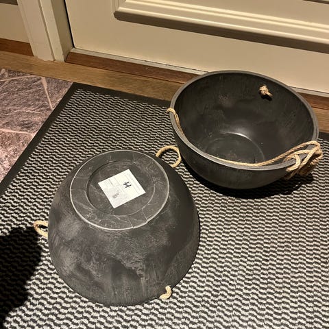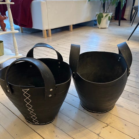 Svart bøtteformet kurv med hank i gummi. Kurven har to kraftige bærehåndtak festet med nagler. Materialet er resirkulert gummi med synlige sømmer og struktur i overflaten. Formen er rund med vid åpning og smalere bunn, egnet til oppbevaring av ved, aviser, leker eller annet utstyr i hjem eller garasje. Kurven kan brukes både innendørs og i tørre utendørsmiljøer der man ønsker en robust oppbevaringsløsning.