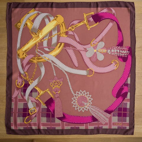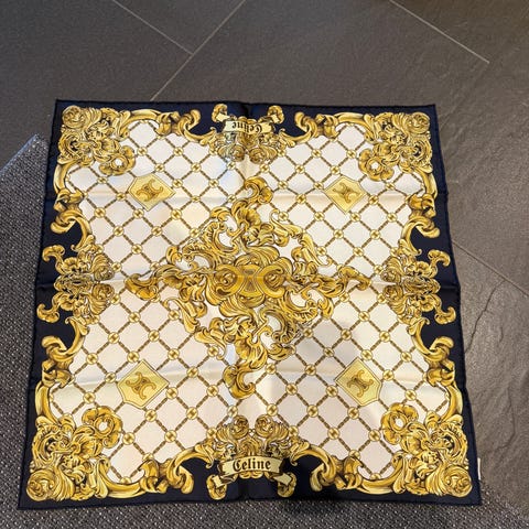 Skjerfet er laget i 100 % silke og gir et elegant og tidløst uttrykk. Det kan brukes rundt halsen, på vesken eller som hodeplagg. Et allsidig tilbehør som passer til både hverdags og penere anledninger. De fine fargene og detaljerte motivene gjenspeiler Céline sin høye kvalitet og klassiske stil.