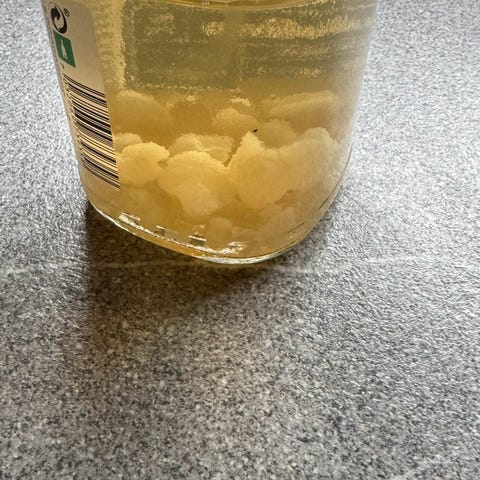Vannkefirkorn i glassbeholder. Kornene er oppbevart i væske og egner seg til videre dyrking av vannkefir hjemme. Mengde og innhold kan tilpasses etter avtale med kjøper. Oppbevares kjølig frem til bruk og brukes til fermentering av sukkerholdig væske for å lage vannkefirdrikk.
