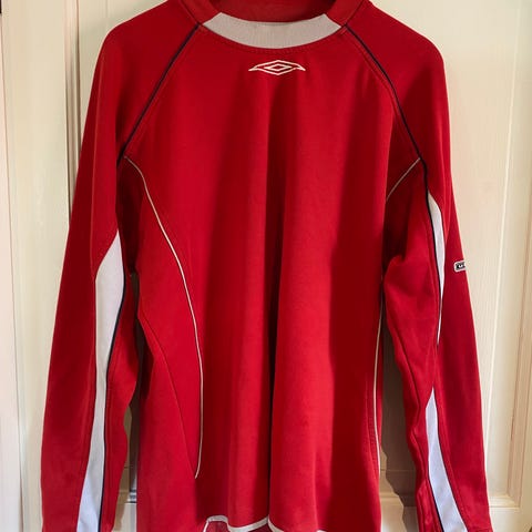 Umbro genser for fotball, herre størrelse L. Genseren er svart med hvite detaljer på skuldre og ermer, samt Umbro-logo på bryst og rygg. Lange ermer med ribbede mansjetter og rund hals. Egnet som treningsgenser eller oppvarmingsgenser til fotball og annen aktivitet.