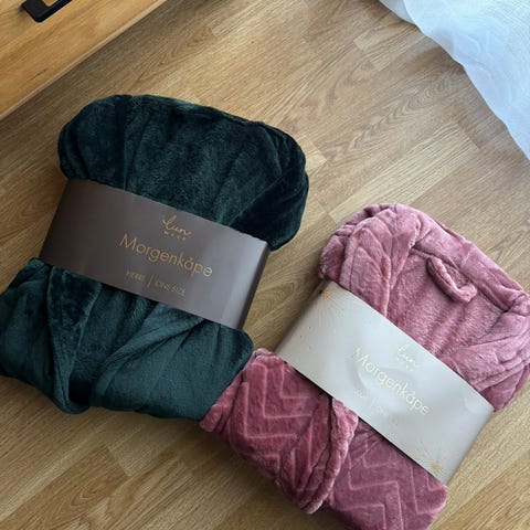 Morgenkåpe i mørkegrønn, ser noe sort, men er mørk grønn farge. Mykt, velurlignende materiale som egner seg godt som behagelig koseplagg hjemme. Passer til bruk etter dusj eller som varm morgen- og kveldskåpe.