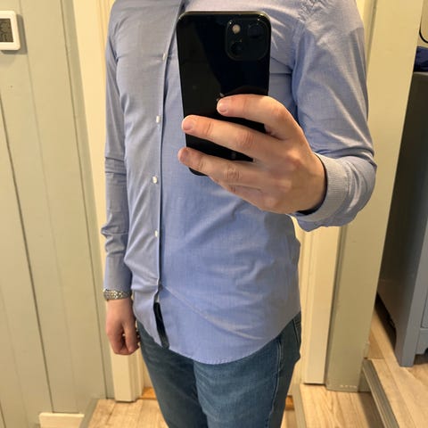 Denne skjorten trenger mansjetter (medfølger ikke). Den er pent brukt og i størrelsen small. Ingen hull eller flekker.