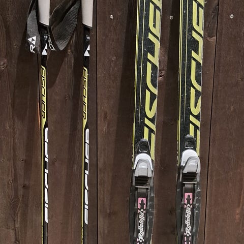 Fischer langrennski med tilhørende staver.