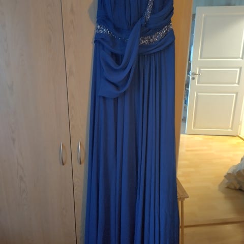 Lang festkjole for dame i størrelse S. Kjolen er blå med blankt, mønstret stoff og tettsittende fasong. Modellen er ermeløs, har rett snitt og splitt i sidene som gir bedre bevegelse. Passer til formelle anledninger som selskap, bryllup eller andre festlige sammenkomster.