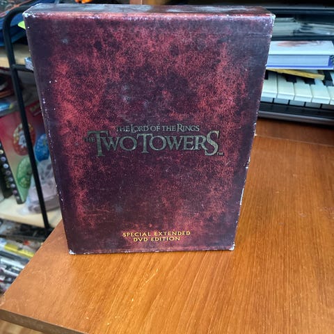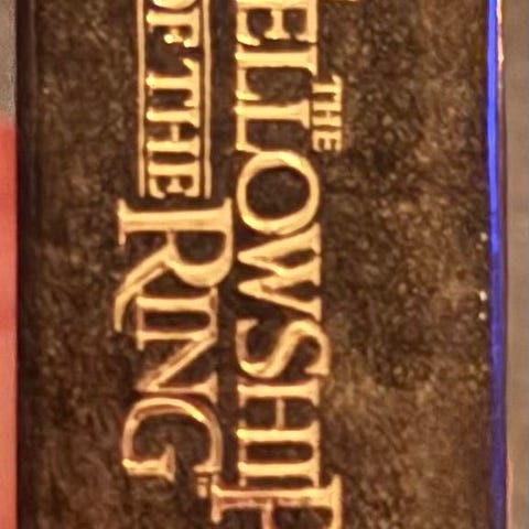 The Lord of the Rings The Fellowship of the Ring DVD i spesialutgave. Filmen kommer i en grønn samleboks med preget motiv og gullfarget tekst på omslaget og ryggen. Egner seg som samlerutgave for de som ønsker fysisk kopi av filmen i original innpakning.