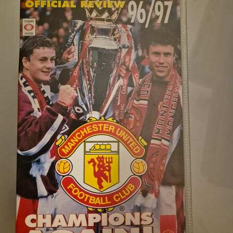 Manchester United Champions of Europe VHS-film. Dokumentar/film om Manchester Uniteds triumf i Champions League, med klipp fra kamper, feiring og intervjuer. Format: VHS-kassett, tekst og innhold relatert til klubbens europeiske mesterskapstitler. Passer for samlere av fotball- og Manchester United-relaterte videoer og for de som ønsker å se historiske høydepunkter fra klubbens europacup-sesong.