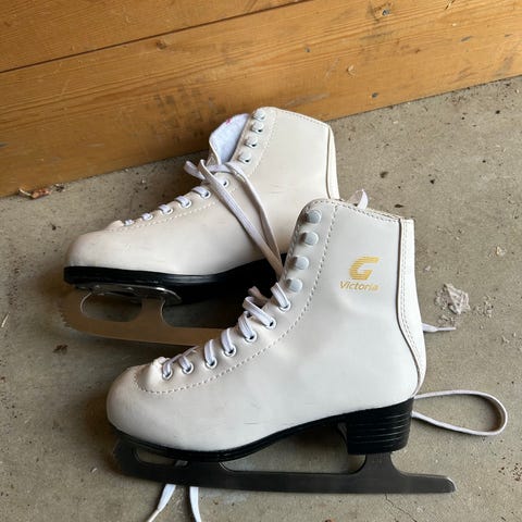 Graf Victoria kunstløpskøyter i størrelse 38. Klassiske hvite skøyter med snøring og hæl, egnet for kunstløp og generell skøytebruk. Blad i metall med tagger foran for kontroll ved igangsetting og stopp. Leveres i original eske med modell- og størrelsesangivelse på siden. Må hentes, sendes ikke.