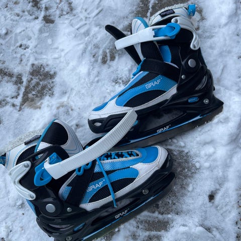 Graf barneskøyter i størrelse 31-34. Skøytene har justerbar plaststøvel med snøring, borrelås og spennelås for god tilpasning rundt foten. Fargekombinasjon i blå, svart, hvit og grå. Passer til barn som trenger allround skøyter til bruk på isbaner og frosne vannflater.