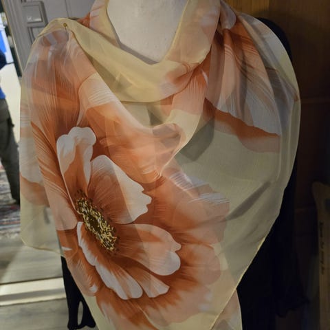 Nydelig skjerf i gult med fargerike valmuer. 50 x 150 cm,