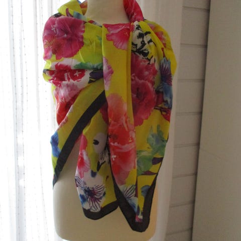Skjerf i gult med fargerike valmuer 50 x 50 cm. Polyester,