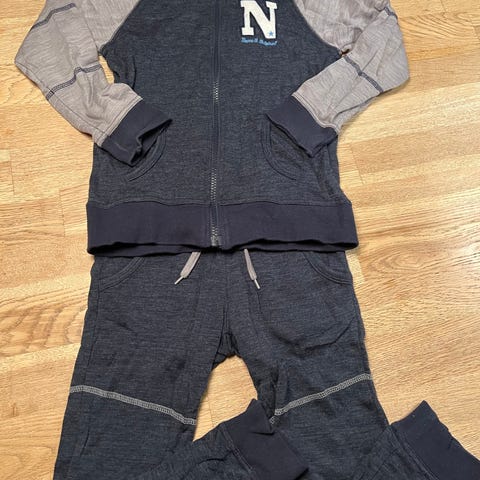 Name it ullundertøy sett for barn i størrelse 122/128, unisex. Sett med langermet trøye og longs i blå ull. Egnet som innerste lag til hverdagsbruk og utendørsaktiviteter i kaldere vær.