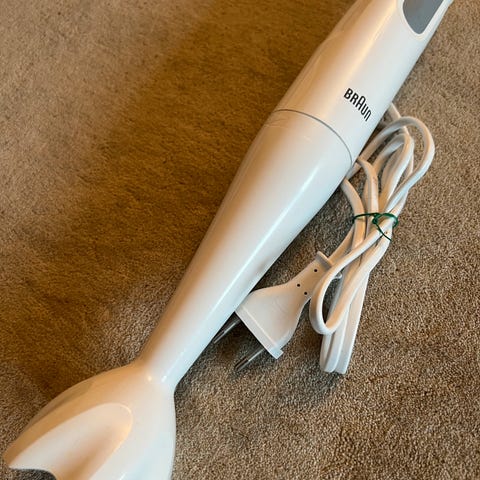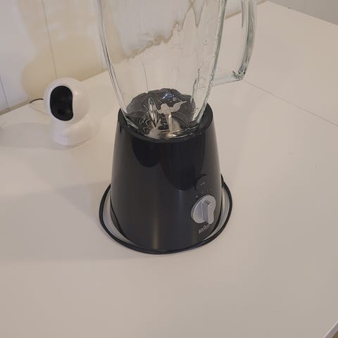 Braun blender i hvit utførelse med glasskanne. Blenderen har justerbar hastighet via dreiehjul på fronten, samt pulsfunksjon. Kannen har helletut og lokk med åpning for påfylling under bruk. Egnet for miksing av smoothies, supper og andre flytende eller myke ingredienser i husholdningen.