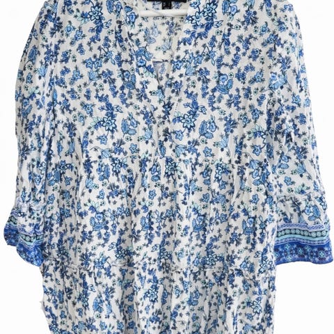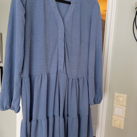 Usikker på stoffet da jeg har klippet av lapp, men er svalende mot kroppen og lett. Strikk nederst på ermene. Skjønn sommerkjole