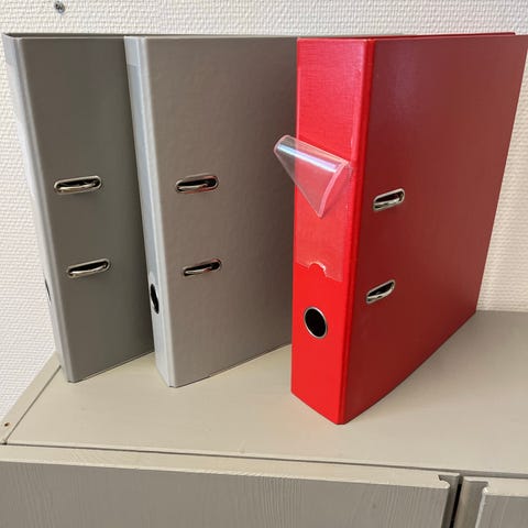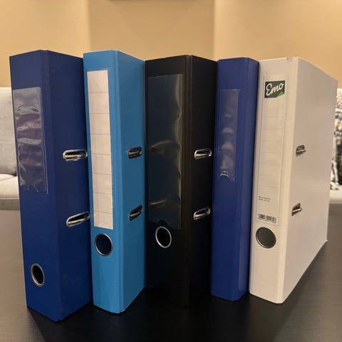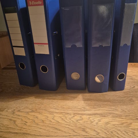 Ukjent merke ringpermer A4 i blandede farger. Noen synlige bruksmerker. Pakken inneholder flere permer i ulike farger, blant annet svart, grønn, rød og mønstret blå. Permene har metallmekanisme med to eller flere ringer for innsetting av hullperforerte ark i A4-format. Egner seg til oppbevaring og organisering av dokumenter, skolepapirer eller annet arkivmateriale hjemme eller på kontor.