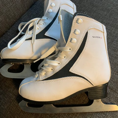 Kunstskøyter i hvit farge. Klassisk høy skaftmodell med snøring og stålklinge. Eldre skøyter er i skin, nyere syntetisk stoff i sko. Alle er skarpe, disse er rett til bruk.