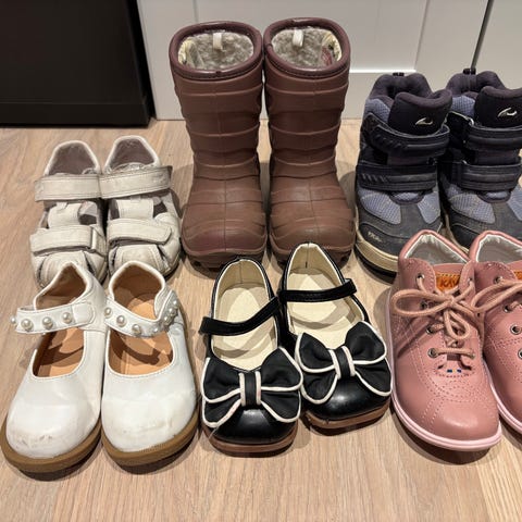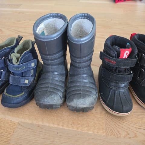 Fem par barnesko størrelse 24. Ett par forede støvler, tre par vinterstøvler/vintersko, ett par vårsko. Godt brukt, men alle er hele, tette og varme. Selges samlet. Se bilder.