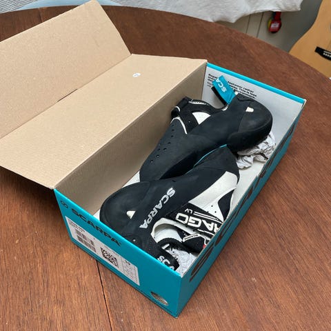 Scarpa Drago klatresko i gul og rød farge. Modellen har borrelåslukking over vristen og drahemper bak for enklere av- og påtaking. Skoene har asymmetrisk og nedoverbøyd lest som er typisk for mer presis klatring. Yttersålen er i gummi for godt friksjonsgrep på klatreflater. Egnet til innendørs og utendørs klatring avhengig av behov og passform for brukeren.