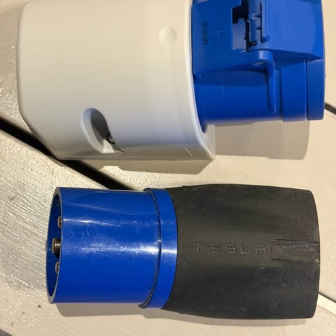 Adapteren gjør det mulig å lade Teslaen din med Teslas originale ladekabel via et blått 32A CEE-uttak. Slike uttak er vanlige på campingplasser, i marinaer, industribygg og på enkelte hytter.