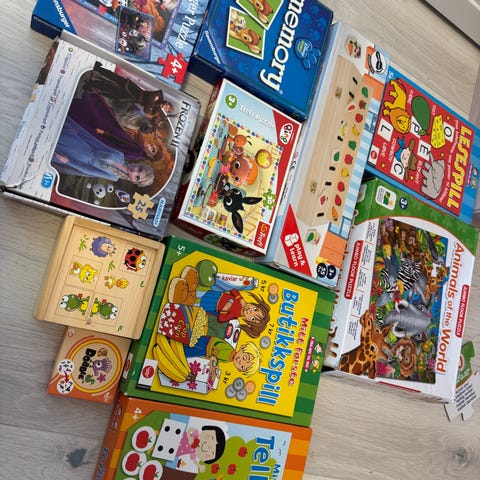 Passer barn fra ca 1-3 år. Noen mer brukt enn andre. Alle er komplette bortsett fra et puslespill som mangler en brikke (skilpadde).