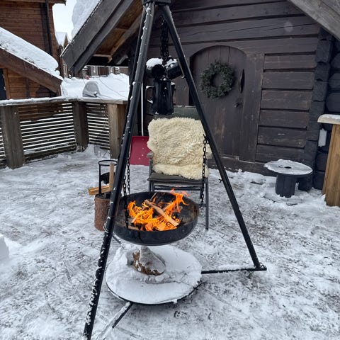 Trefot til bålpanne i metall med hjul. Passer til utendørs bruk på terrasse, gårdsplass eller andre faste underlag der man ønsker å kunne flytte bålpannen ved behov. Farge: svart. Materiale: metall.