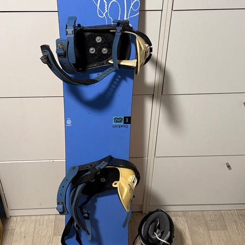 Snowboard i hvit og blå farge selges pga det ikke blir brukt. Brettet har klassisk twintip-form med innfelte skruehull for montering av bindinger. Passer til bruk i alpinbakke og park. Lengde på brettet er 148 cm