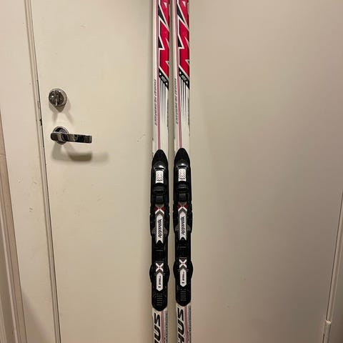 Det er også et par alpinski fra Head med integrerte bindinger 137 cm lengde. Pent brukt. 300 kroner.