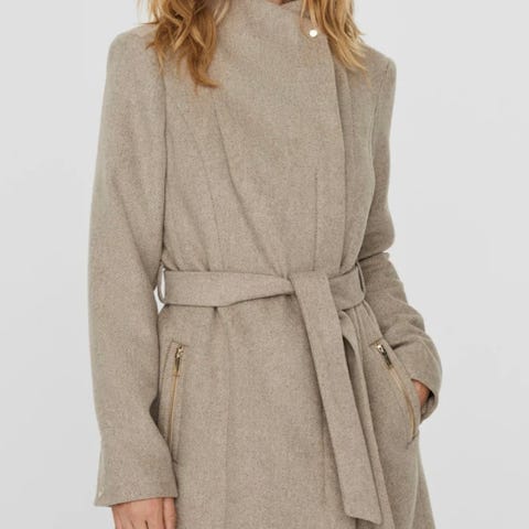 KappAhl kåpe i ull for dame i størrelse 44,46. Kåpen er mørk blå og laget i en ullblanding med fôr. Den har hette, store frontlommer og lukkes med treknapper/spenner foran. Rutete innerfôr i brune og beige toner. Egnet som yttertøy i kjøligere vær.