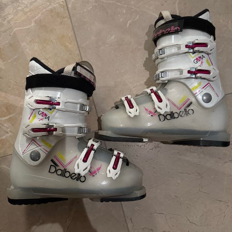 Dalbello Gaia 4 alpinstøvler i hvit med rosa detaljer. Støvlene har fire justerbare spenner i metall og gummisåle med utskiftbare hæl- og tåplater. Passer til vanlig alpinbinding. Egnet som barnestøvel.