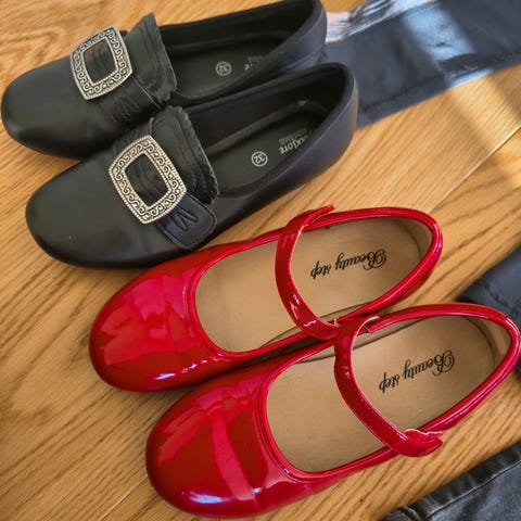 Ballerinasko for jente i størrelse 35. Skoene er svarte med rem over vristen og liten hæl. Innvendig har de prikket såle, og yttersålen er mønstret for bedre grep. Egner seg til både hverdag og penere anledninger.