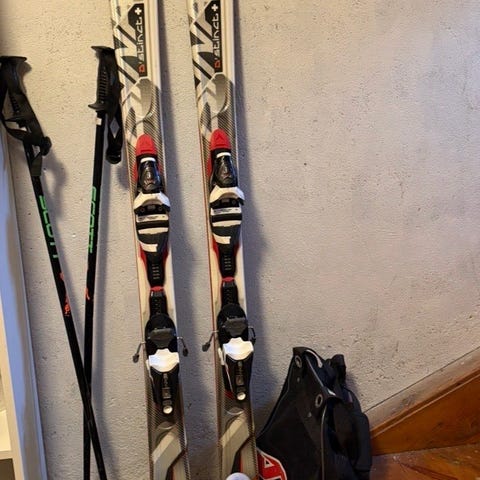 Dynastar 141 alpinski med staver, Nordica alpinstøvler, hjelm og briller