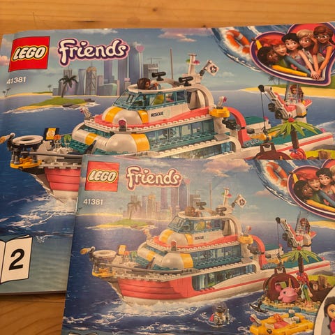 LEGO Friends redningsbåt lekesett. Sett med stor redningsbåt med flere dekk og innredede rom, mindre gummibåt, øy med strand og delfin. Komplett sett med alle deler og tegninger