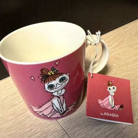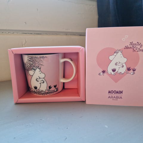 Arabia Mymble kopp i porselen med rosa utside og hvit innside. Motivet viser Mymble-figuren fra Mummiuniverset på begge sider av koppen. Koppens bunn er merket med «Mymble by Arabia». Egnet til servering av varme og kalde drikker. Tåler oppvaskmaskin og stekeovn ifølge merkingen under koppen.