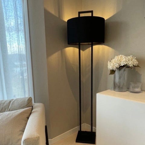 Bohus gulvlampe i svart utførelse med rund marmorfot. Lampen har en slank, buet stamme og en skjerm øverst. Egner seg som belysning i stue, soverom eller andre oppholdsrom der det er behov for punkt- eller stemningslys.
