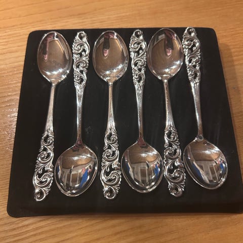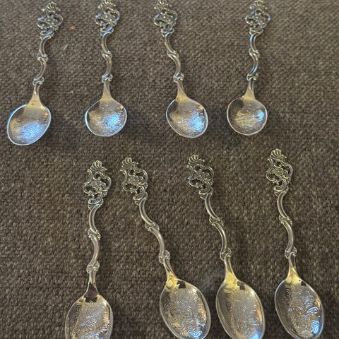 Teskjeene er ubrukt og har alltid blitt oppbevart i esken. Kremskjeen er arvet og har noen få bruksmerker. Aldri brukt av meg.