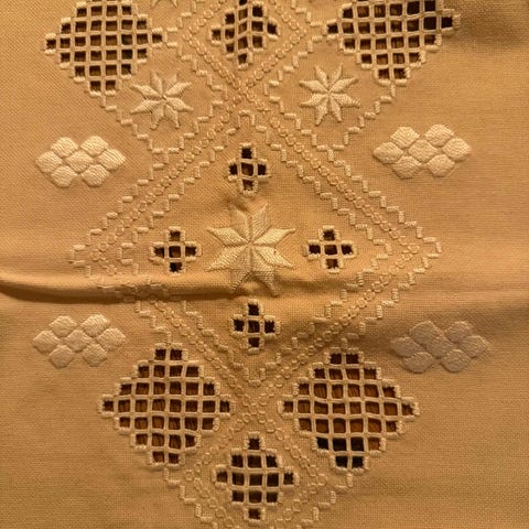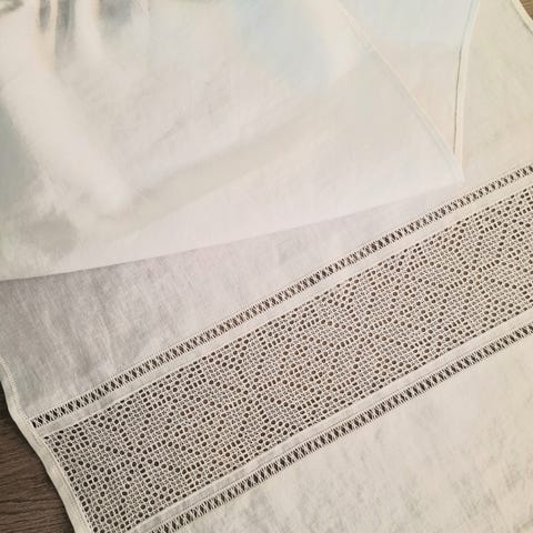 En håndbrodert hardangerduk, en håndbrodert med broderi i bomull og to broderte (kjøpt). Tekstilene er hvite med ulike broderte mønstre, blant annet blomsterborder og geometriske motiver i flere farger. Passer som bordduk, eller til andre dekorative formål i hjemmet.