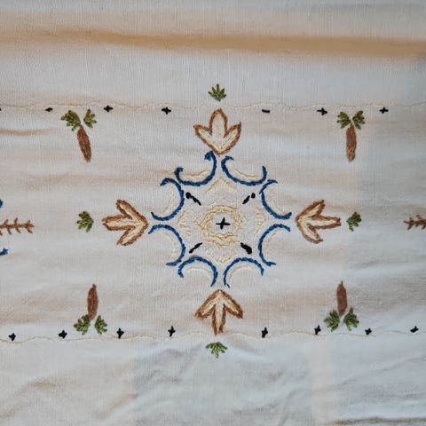 Håndbrodert i bomull str. 1,05 x 2 m kr. 700,-.