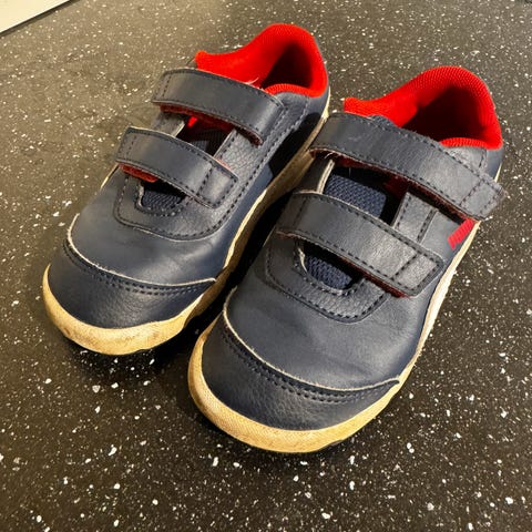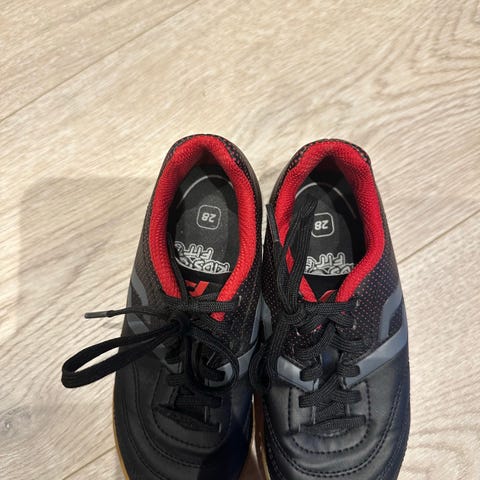 Sorte og røde innesko i str 31. Har vært noe brukt ute så sålen har noe grus under. Kan vaskes bort.
