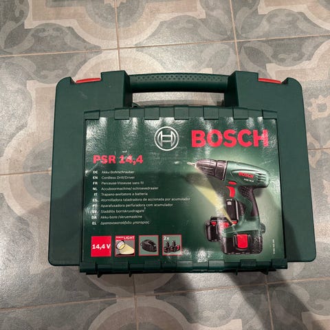 Godt brukt Bosch PSR 1800 batteridrill med lader. Fungerer helt fint.