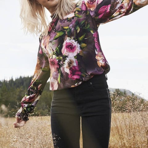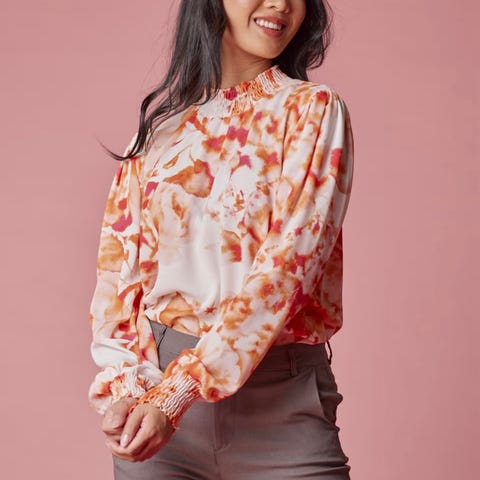 – Feminim silkebluse med rød bunnfarge og blomsterprint i rosa og offwhite