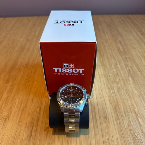 Tissot herreklokke med rund urskive og kronografvisning. Klokken har mørk urskive med tydelige timemarkeringer og datovindu.