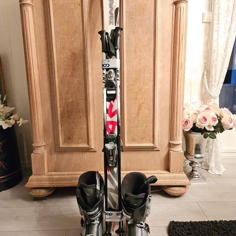 Dynastar Starlett alpinski med bindinger og staver. Skiene er noen år gamle, men ikke veldig mye brukt. Stålkantene kan trenge litt sliping, og sålene litt gliding. Ellers fine. Lengde 130 cm