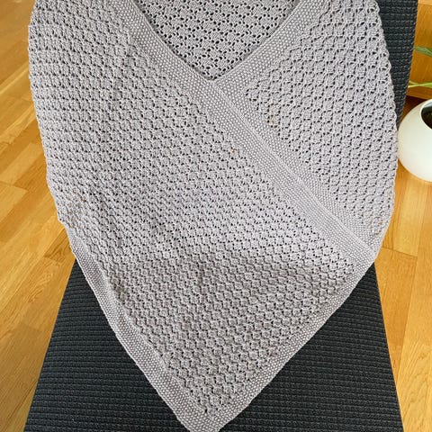 Poncho i alpakka ull fra Anna strikk. Lende 106 cm bredde 156 cm. Fra kant til kant. Lende i mitten 61 cm bredde i mitten 60 cm.