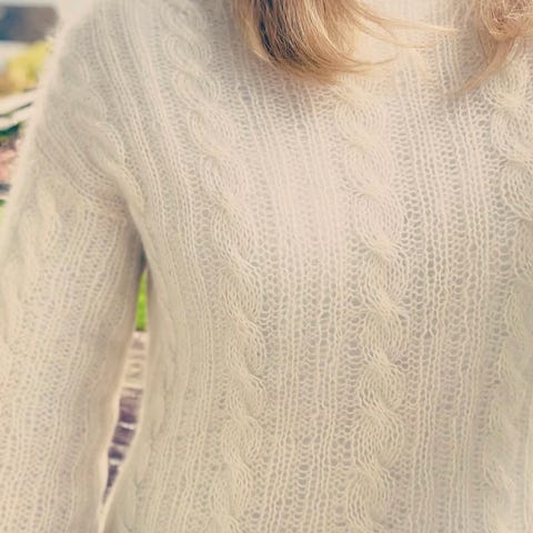 Novice cardigan fra Petite Knit strikket i Tynn Kid Silk Mohair fra Sandnes Garn. Størrelse L. Modellen er 176 cm/slank.