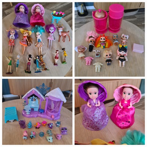 Selger en stor pakke med div shoopkingsfigurer, enchantimals, hatchimals, tingeling figurer og muffins dukker med masse tilbehør.