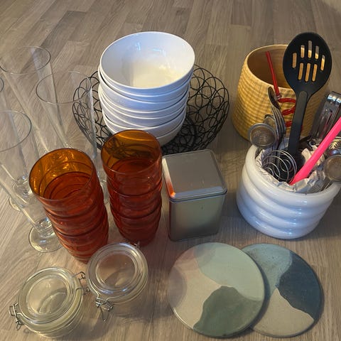 Div kjøkkenutstyr, glass, fruktkurv, tapasfat, serveringsskål, blomsterpotte etc
